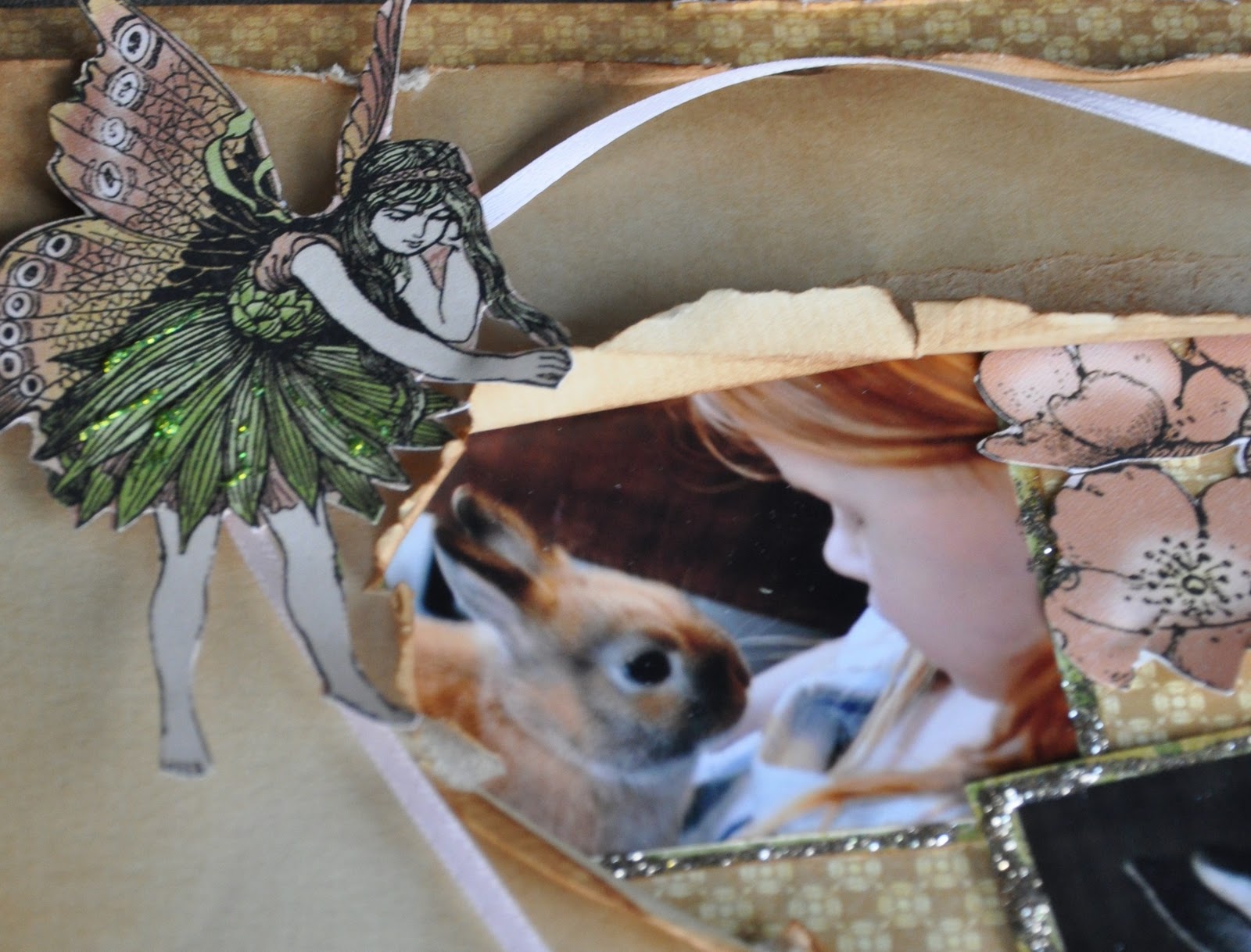 Here is my DT reveal for Sketchabilities Sketch #59. So I was excited to use these cute pictures of my daughter with her new bunny, they were the perfect size for this sketch because you could use small pictures for it. However I find it very hard to scrapbook with lots of pictures. I used to do it in a blink of an eye, but nowadays, I usually only scrapbook one picture at a time. Needless to say I struggled a little. My idea was to rip the page and protrude the pictures through the holes. However once I did that, the page looked too blank and I didn’t know what else to add. I decided to cut some flowers and fairies from the Graphic 45 line “Once upon a springtime”. I love the graphics in that paper line so much. I can’t decide if I’m happy or not with the result. I need an outsiders honest opinion on the matter because I’ve been staring at the page for far too long and I can’t figure out if it came out the way I imagined it.