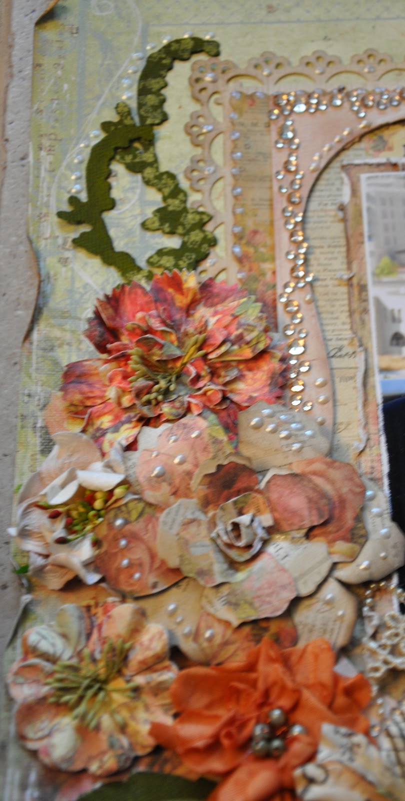 I made this layout for the Prima BAP. I used their sketch and lots of Prima goodies including my all time favourite Canvas resist products which I sprayed with Aridondak green. I also used the Romantique line and a couple of Martha Stewart punches to decorate them with. The chipboard is part of my daughter’s board game. I loved the shape and it fit the layout perfectly. I painted it with Gesso and inked it with Distress dye. I used Say it with Crystals and different Prima flowers to decorate and at the top corner is a DA chippie!!