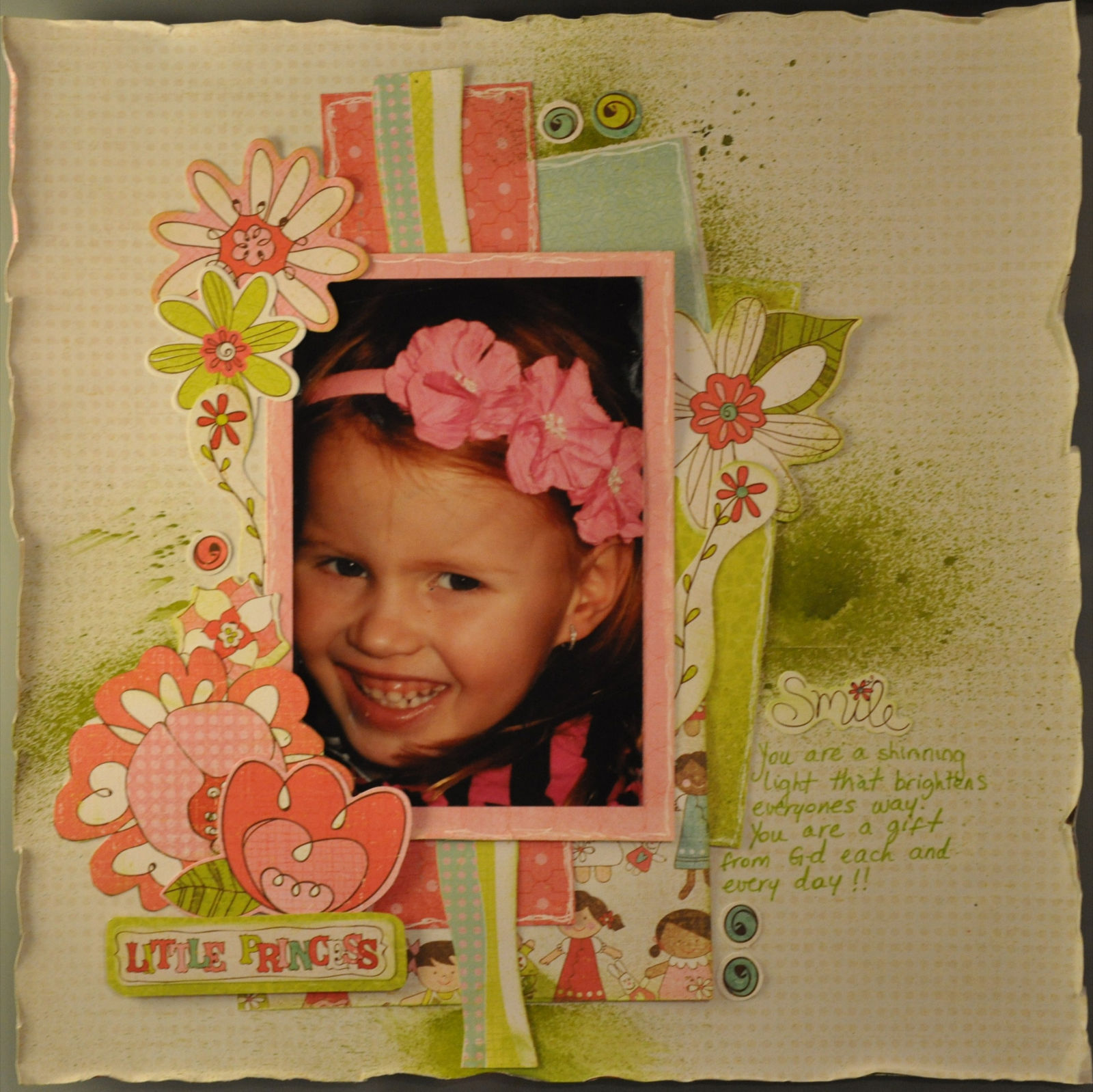 This is my second DT layout for Sketchabilities. I flipped the layout so it fits this beautiful picture of my daughter. I used these very cute and girly papers by Crate Paper. I really like spraying and inking paper but I always find it difficult because the spray doesn’t always go where you want it to and then its so hard to correct mistakes.