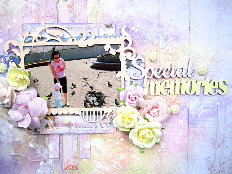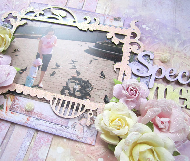 I stencilled the background with the bamboo leaves stencil and light molding paste. Then I sprayed it with Prima’s Color Bloom sprays: Cotton Candy, Sunshine and Iris.