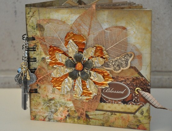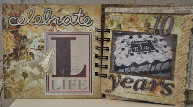 I wanted to make a mini-album about a party I had 2 years ago in which I celebrated LIFE with most of my family and close friends. In the year 2000 I had a liver transplant and got a second chance at life. In the summer of 2010 I decided to have a party and thank G-d for giving me another chance at LIFE and thank all the people close to me for being in my life. This album represents that event. It took me this whole past week to embellish it (hence I haven’t posted any layouts) however I’m quite pleased with the results. Unfortunately you will not be able to see it fully because I’m not including pictures of other people (to protect their privacy) I only included pictures of my immediate family and of my grandmother (Z.L). So if you see blank cardstock, its where the pictures ought to be. One of my favourite embellishments is the metal flower in the front. It is embossed and painted with alcohol inks. Then I added feathered leaves behind it. The message in the book is obvious: I’m thankful, blessed, grateful for everything that has been given to me in my life by both G-d and the close people in my life.