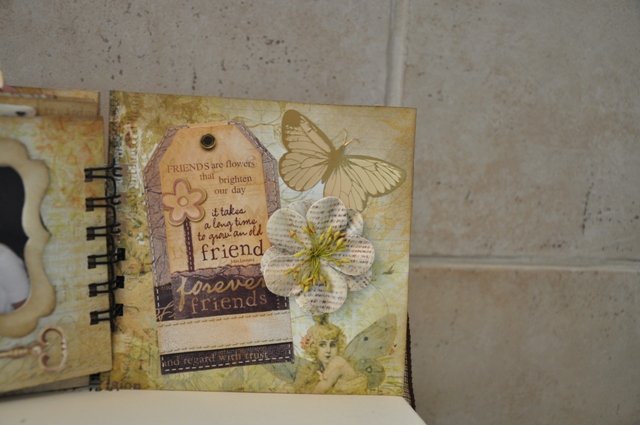 Here is another mini album I’ve recently finished. I love how it turned out but its just too much work. I love the way mini albums look but I rather make layouts because its faster. I spent hours embelishing this album. A few months ago I attended a class to learn how to work with metal. Although I knew some of the tecniques, its always good to learn new tricks from someone else. During the class I assembled the pages for this mini- album and left it blank for a while. I used papers from Bo-Bunny Timepiece and Gabrielle, Pink Paislee Butterfly Garden and some old looking papers. I love the colors and theme of this layout.