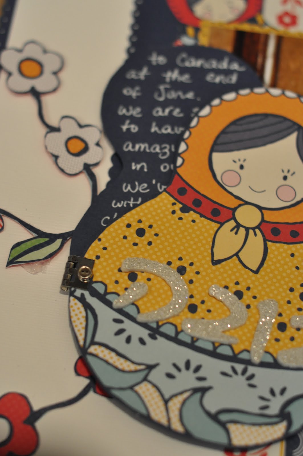 September 1st challenge at Once Upon a Sketch is based on the sketch below. The journaling criteria for this challenge was to write about a memorable year and include it in the title. I choose 2008 because it is the year we adopted our daughter from Russia. I used these amazing Kaisercraft papers with Russian nesting dolls because it fit the theme so well. The title of the layout says Buba in Hebrew which means Doll. the journaling is hidden behind the big Nesting Doll. I traced another doll and used a hinge to make them open up for writing (as you can see in the close-up pictures). I liked this idea because nesting dolls usually have other dolls inside of them.