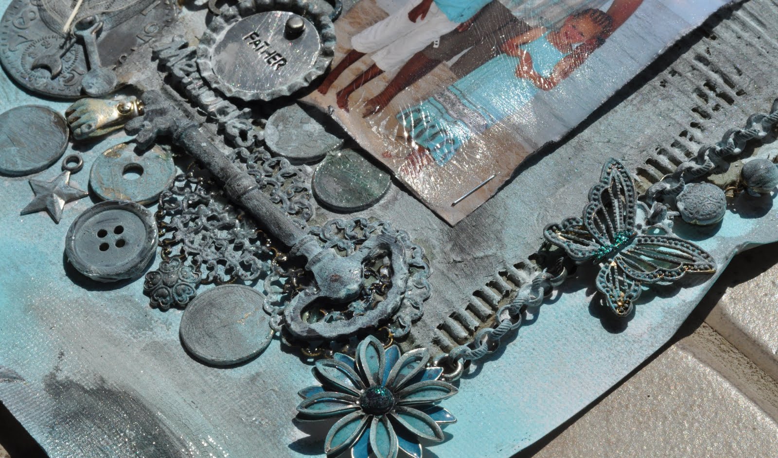 Then I found old broken necklaces and charms, coins, a button and a bottle cap. I also used a lot of old scrapbooking metal embellishments that were just sitting at the bottom of my box.