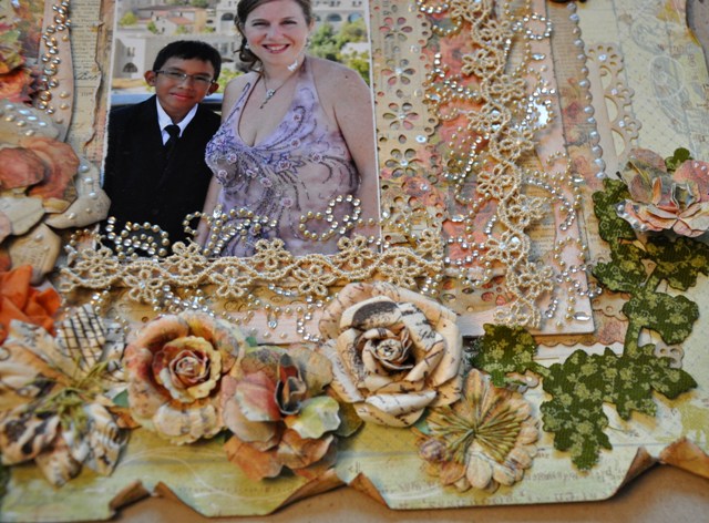 I made this layout for the Prima BAP. I used their sketch and lots of Prima goodies including my all time favourite Canvas resist products which I sprayed with Aridondak green. I also used the Romantique line and a couple of Martha Stewart punches to decorate them with. The chipboard is part of my daughter’s board game. I loved the shape and it fit the layout perfectly. I painted it with Gesso and inked it with Distress dye. I used Say it with Crystals and different Prima flowers to decorate and at the top corner is a DA chippie!!