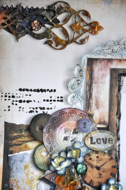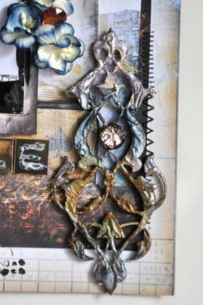 The sketch I used was the May sketch from Dusty Attic. I used these fantastic 7 Dots Studio papers along with some Dusty Attic flourishes that I painted with moulding paste and then sprayed with different inks. I love 7 Dots papers they are so easy to work with. First I was scared to use them as I would never be able to compare myself with Finnabair, however I’m glad my layouts came out similar to my style and I’m extremely satisfied on how they turned out.
