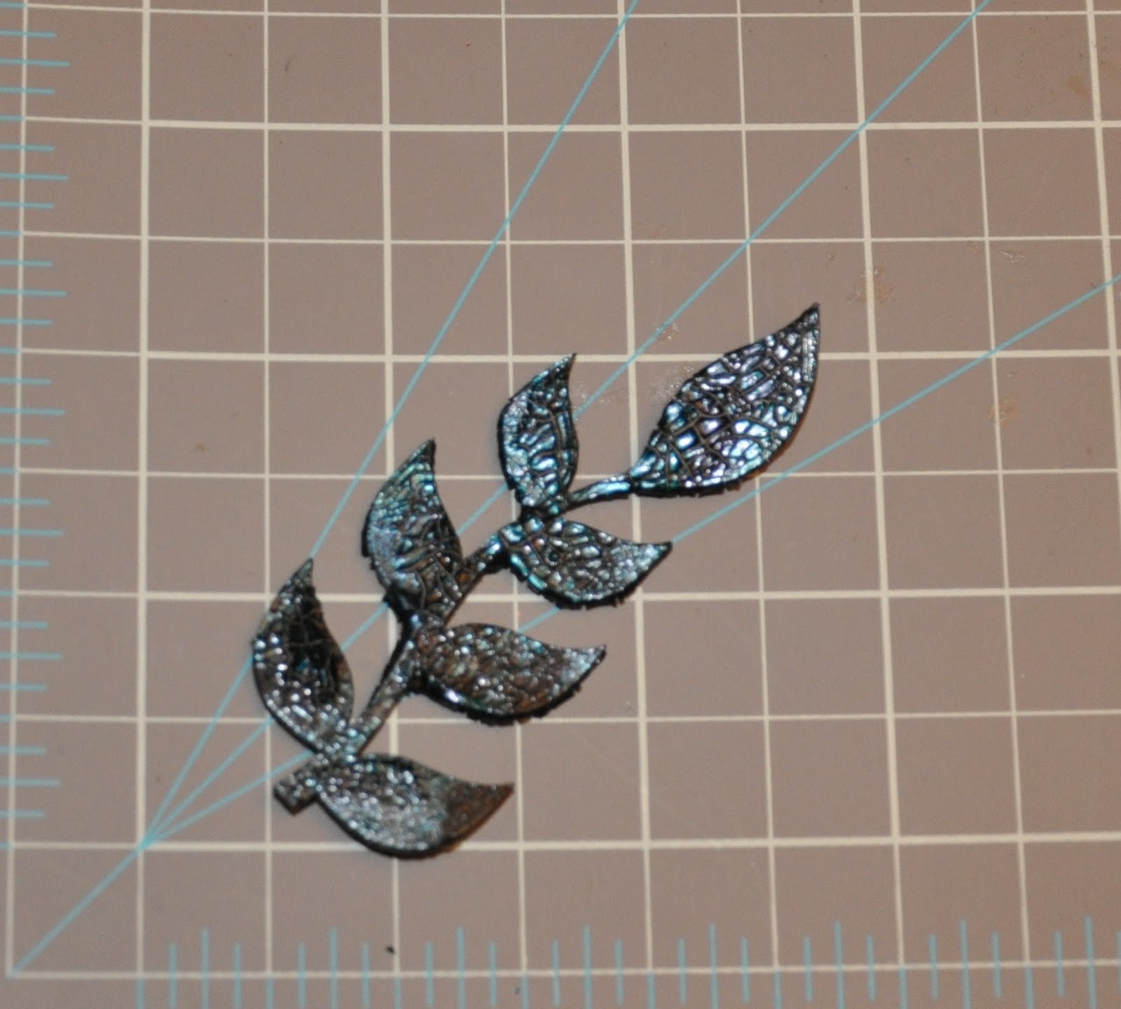 I like learning new ways of experimenting with my products. A few months ago I bought Crackle Paint by Viva Decor in many different colours. I’ve been using them on chipboard, grunge paper and even on cardstock. They give an amazing thick crackle effect. I’ve even inked over them with distressed dyes. However what I didn’t know, and I learned in this class is that you could use alcohol inks on the crackle to accent the colour. I decided to experiment on some Dusty Attic chipboard and I’ve attached a tutorial on how to make these beautiful crackled vines. (see below).