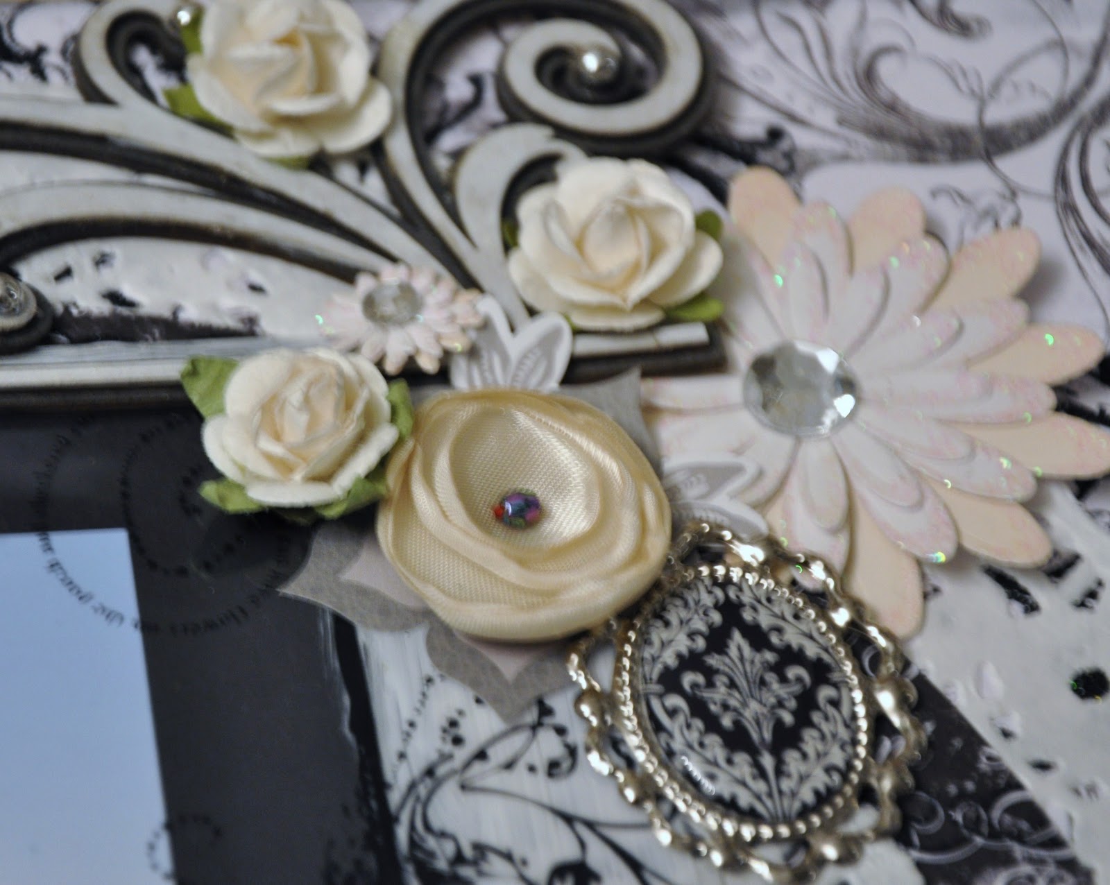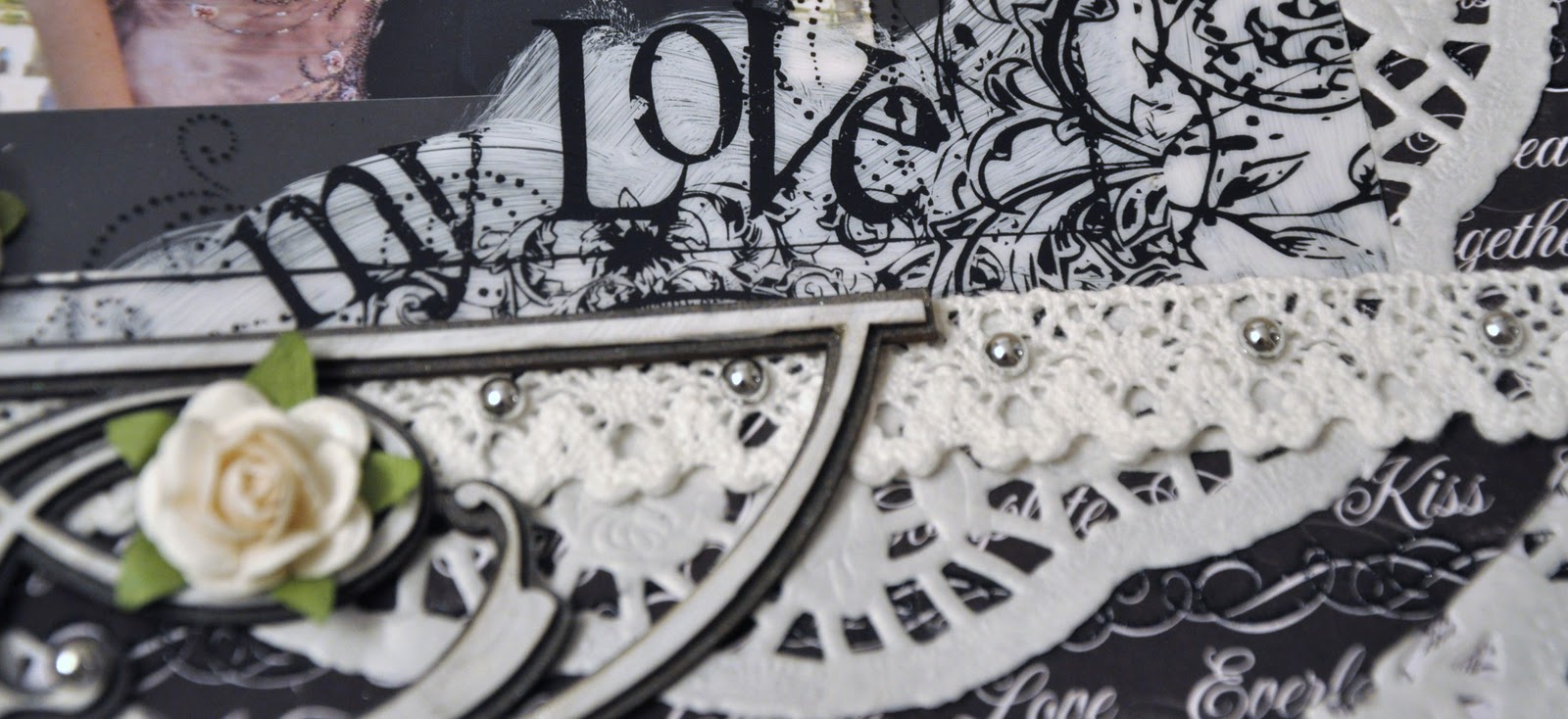 Here is a layout I made for the Bo Bunny Layout Challenge Friday. The challenge is to use circles on the page. I used many large circles and doilies underneath the picture and some flowers and gems that were shaped like a circle. The sketch I used was from Creative Scrappers Sketch # 185. I inverted the sketch 180 degrees like a mirror so the DA chipboard would fit the layout. I love this piece of chipboard because it has a shadow. I sprayed the shadow piece in black and painted the top piece in white. I used the Bo Bunny Enchanted paper line. How gorgeous are they? I love the black and white. Its so elegant. I used a picture of my husband and I at his brother’s wedding this past summer. Formal pictures go so elegantly with these papers. Finally I used a Prima transparency frame with lots of flourishes and the title “My Love” on it. I painted the back around the frame with white gesso to make the printed frame stand out.