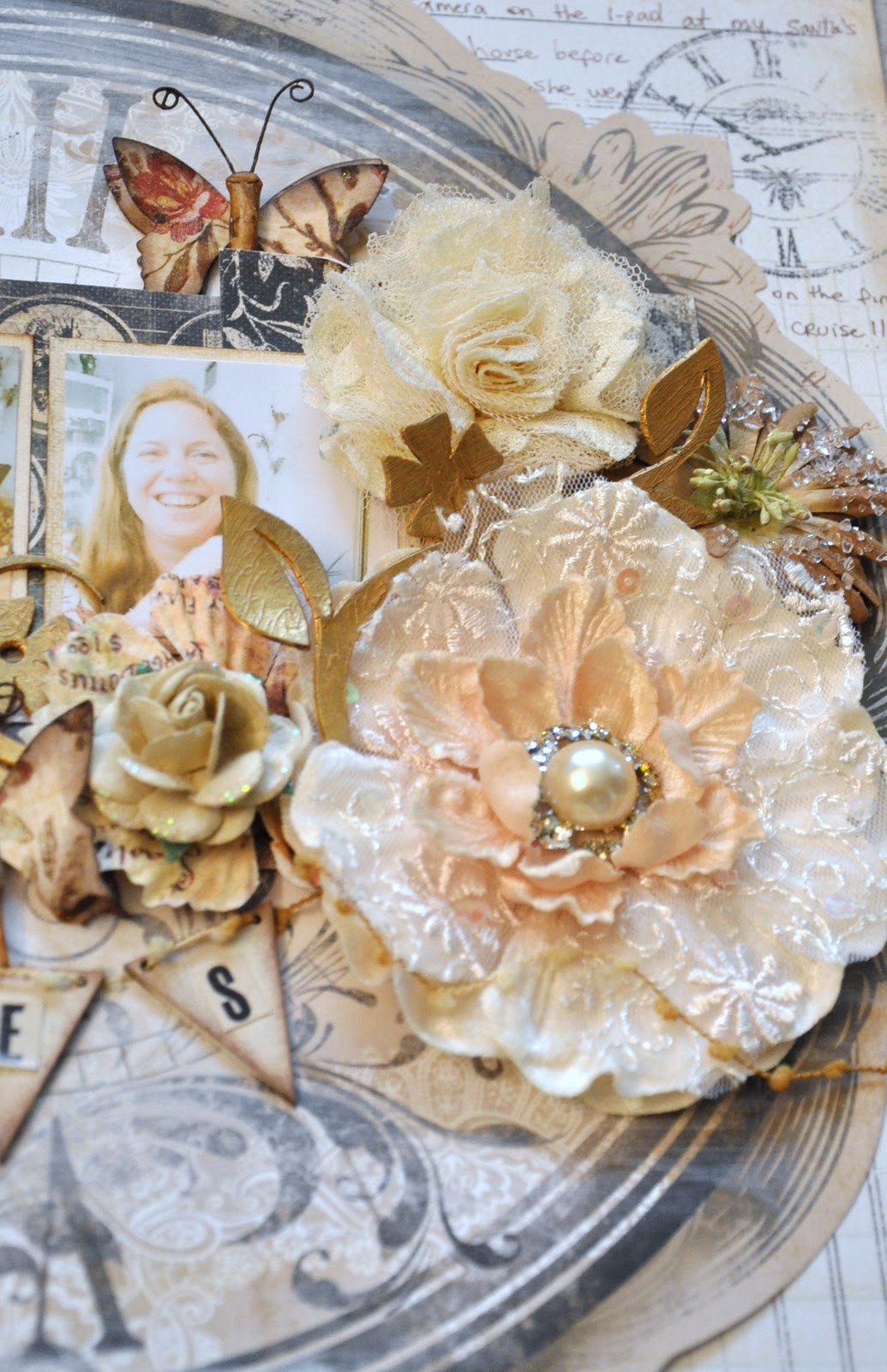 I used lots of prima goodies and some other beautiful embellishments I had. The banner is dusty attic and the flower flourish is from A to Z scraplets. I used gold crackled paint on the flourish to give it a distressed look. Look at the close-ups.