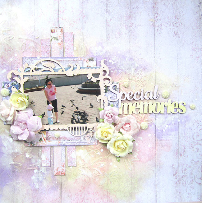 I stencilled the background with the bamboo leaves stencil and light molding paste. Then I sprayed it with Prima’s Color Bloom sprays: Cotton Candy, Sunshine and Iris.