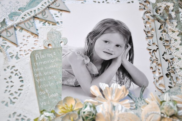 This is my new soft, pastel layout I made for the Bobunny layout challenge and for Sketch #190 at Creative Scrappers. I really liked this sketch because it has a big circle, a doily and lots of flowers which are 3 of my favourite things. Bobunny gave us an inspirational room challenge (picture below). You could get inspired in any way or form. I got inspired from the colours of the room, the banner, the butterfly mobile and the little girl sitting in the room (you can hardly tell she’s there). Therefore, I thought it would be perfect to make this layout about my daughter. I used the Gabrielle papers by Bobunny. I took 2 of the same papers and combined them to make a full piece blue flourished circle behind the doily. Believe it or not it didn’t come that way. I also cut the big blue butterflies in the centre of the paper and stacked them on top of each other with pop-dots to give it depth. If you look back at your Gabrielle papers you will see that such full circled flourish does not exist but you must build it from two separate pieces. Finally I added some lace, Dusty attic chipboard, strings of pearls and lots of flowers. I’m absolutely in love with this layout!!. I love working with white and pastel colours, I love the soft look it gives the layout.