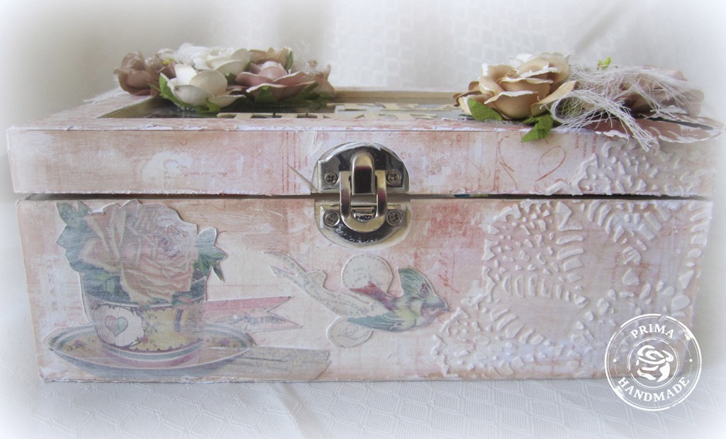I cut out images from the Delight papers and glued them with Matte Gel Medium on the sides of the box. I embellished the lid both inside and out with Prima flowers.