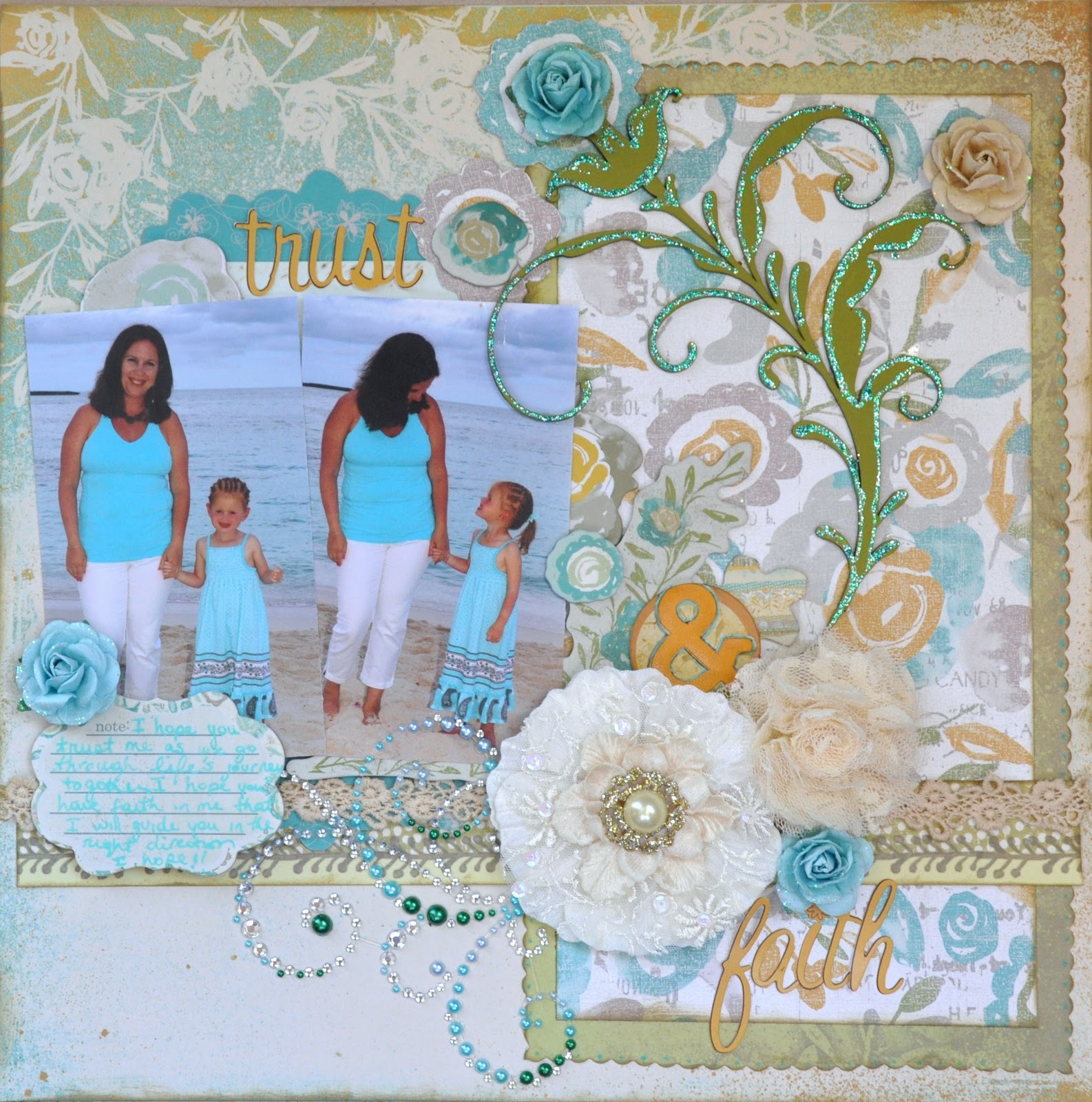 This is my Design Team Reveal for Bird is the Word. The word this time was TRUST. I used these two pictures of my daughter and I holding hands. I thought these were the perfect pictures for this layout. I used the “Alla Prima” papers from Prima along with some of their flowers, chipboard and gemstones. I also used the flower flourish from Dusty Attic. I painted it green and added turquoise stickles highlights. The journaling says: “I hope you trust me as we go through life’s journey together. I hope you have faith in me that I will guide in the right direction. I hope…”