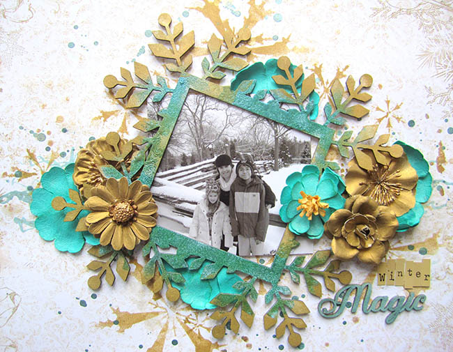 I used the new Vintage Christmas Wonderlan paper for the background. I used a snowflake stencil to create a winter pattern in the background using a golden chalk edger.